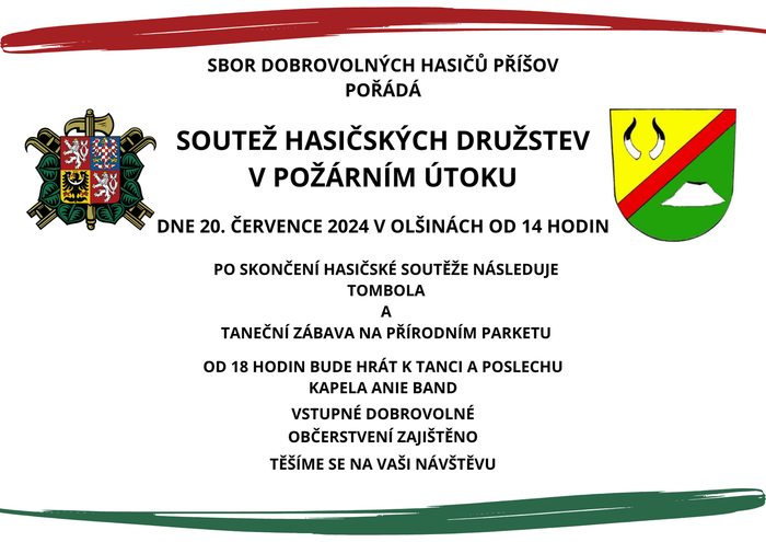SDH Příšov si Vás zve na tradiční hasičskou soutěž v požárním útoku, která se uskuteční v sobotu 20. 7. 2024 od 14 hod. v Olšinách. Po skončení soutěže zahraje kapela ANIE BAND a nebude chybět tombola.