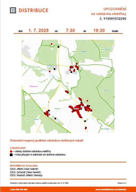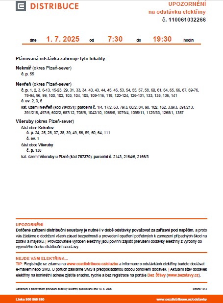 V úterý 1. 7. 2025 v čase od 7:30 do 19:30 dojde v naší obci k plánovanému přerušení dodávky elektrické energie.