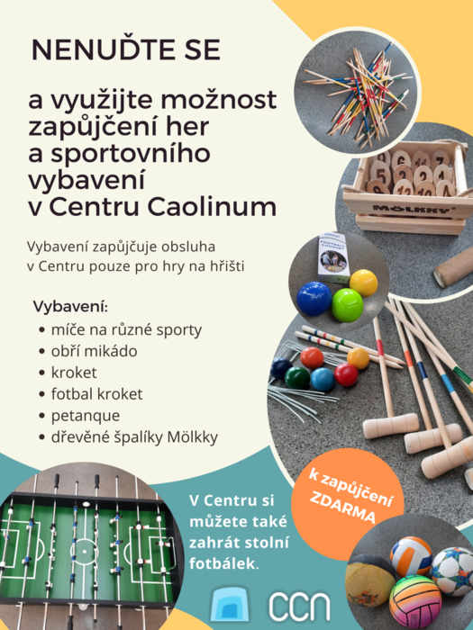 Blíží se prázdniny a s nimi i spoustu volného času pro děti. Centrum Caolinum Nevřeň nabízí možnost zdarma si zapůjčit herní a sportovní vybavení pro hry na hřišti, jako např. míče, obří mikádo, kriket, petanque a další. V době otevírací doby Centra je také možné si uvnitř zahrát stolní fotbálek. Bližší informace u obsluhy.