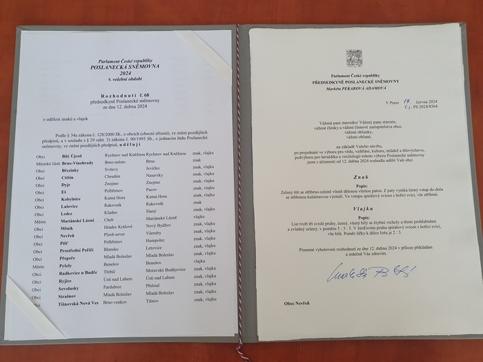 Představitelé celkem 25 obcí, měst nebo městských částí převzali v pondělí 17. června 2024 v Poslanecké sněmovně Parlamentu ČR od její předsedkyně Markéty Pekarové Adamové dekrety, které jim přidělují jejich obecní znak a vlajku. Slavnostní ceremoniál se tradičně odehrál ve sněmovním sále Státních aktů a zúčastnili se ho starostka obce Štěpánka Bejčková a místostarosta Robert Korsa.