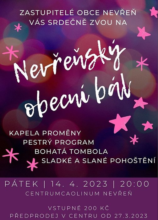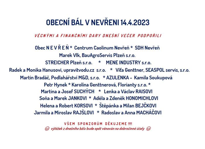 V pátek 14. dubna se již posedmé konal obecní bál a sál jako vždycky praskal ve švech. O hudební doprovod se postarala kapela Proměny a zábavu doplňovalo sladké i slané pohoštění. Hlavním bodem programu (kromě bohaté tomboly) bylo poděkování obce Nevřeň dvěma členům Sboru dobrovolných hasičů Jaroslavu Kašparovi a Jaromíru Šebkovi za získání titulu Zasloužilý hasič, který převzali v květnu loňského roku v Přibyslavi. Po shlédnutí krátké fotoprezentace ze slavnostního předání ocenění převzali oba pánové z rukou starostky a místostarosty poděkování a dárkový koš. Na programu bylo dále taneční vystoupení Street dance v podání nevřeňské Mariannky Melichar a večer se pomalu posunul k vyhlášení hlavní tomboly, která byla jako vždy, díky našim sponzorům opravdu bohatá. Výtěžek z tomboly je každoročně věnován některému z nevřeňských občanů se zdravotním hendikepem. Loni udělal velkou radost obrovský vyřezávaný dinosaurus. Letos putuje výtěžek na výrobu obuvi na míru a na rehabilitační pobyt. Letošní bál se zkrátka povedl, všichni se skvěle bavili a výtěžek z akce udělá radost. A o to přece jde....